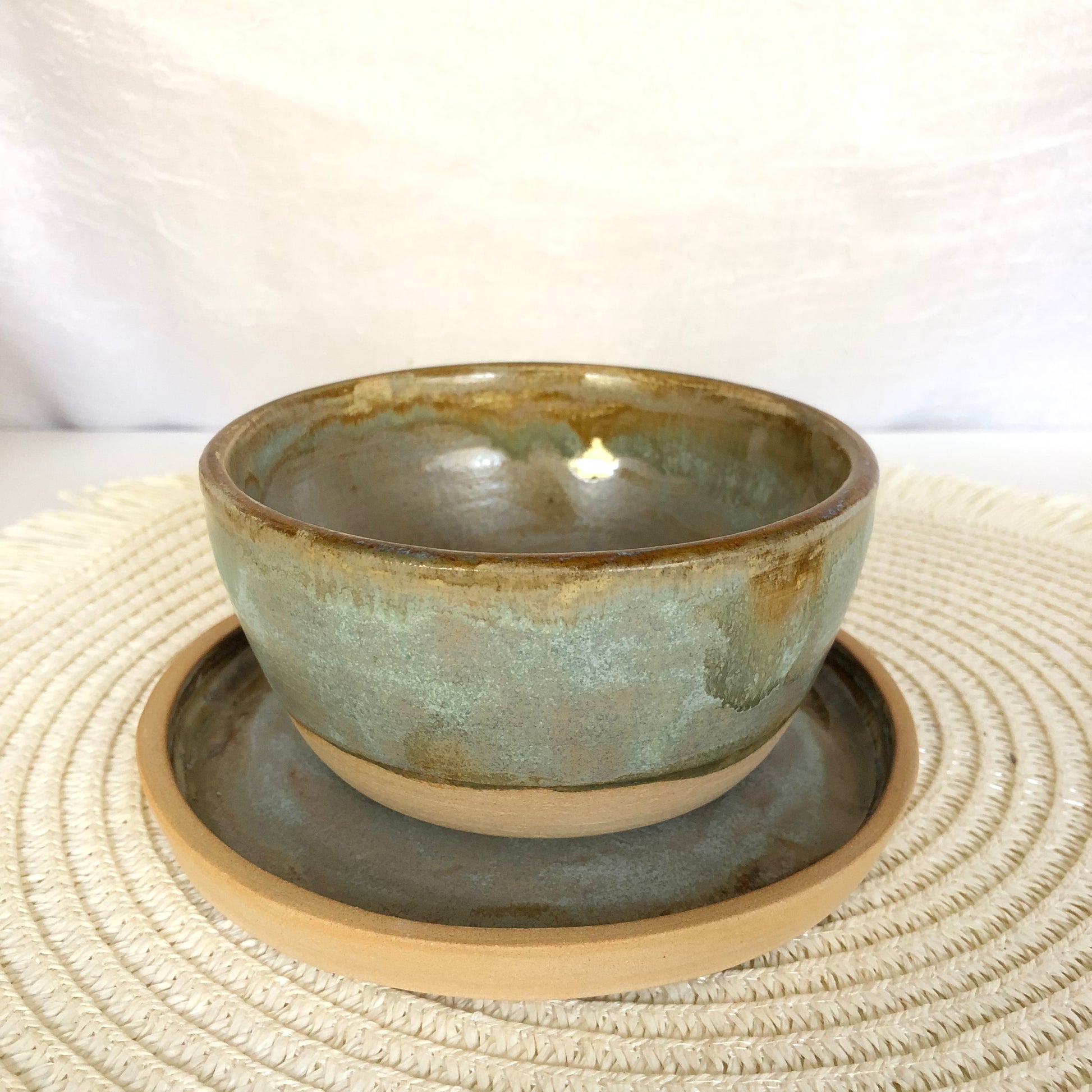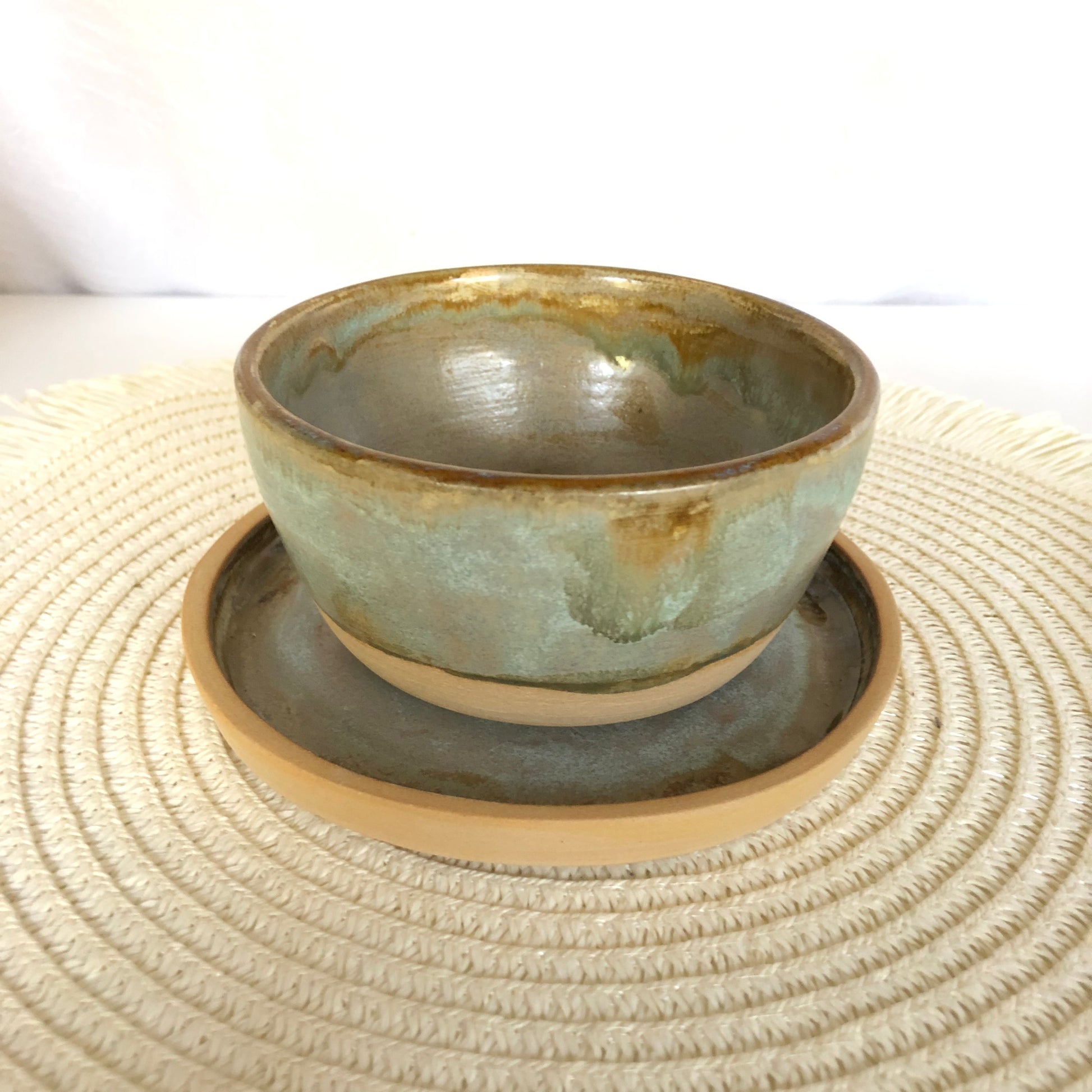 Turned and hand-glazed stoneware bowl with saucer.